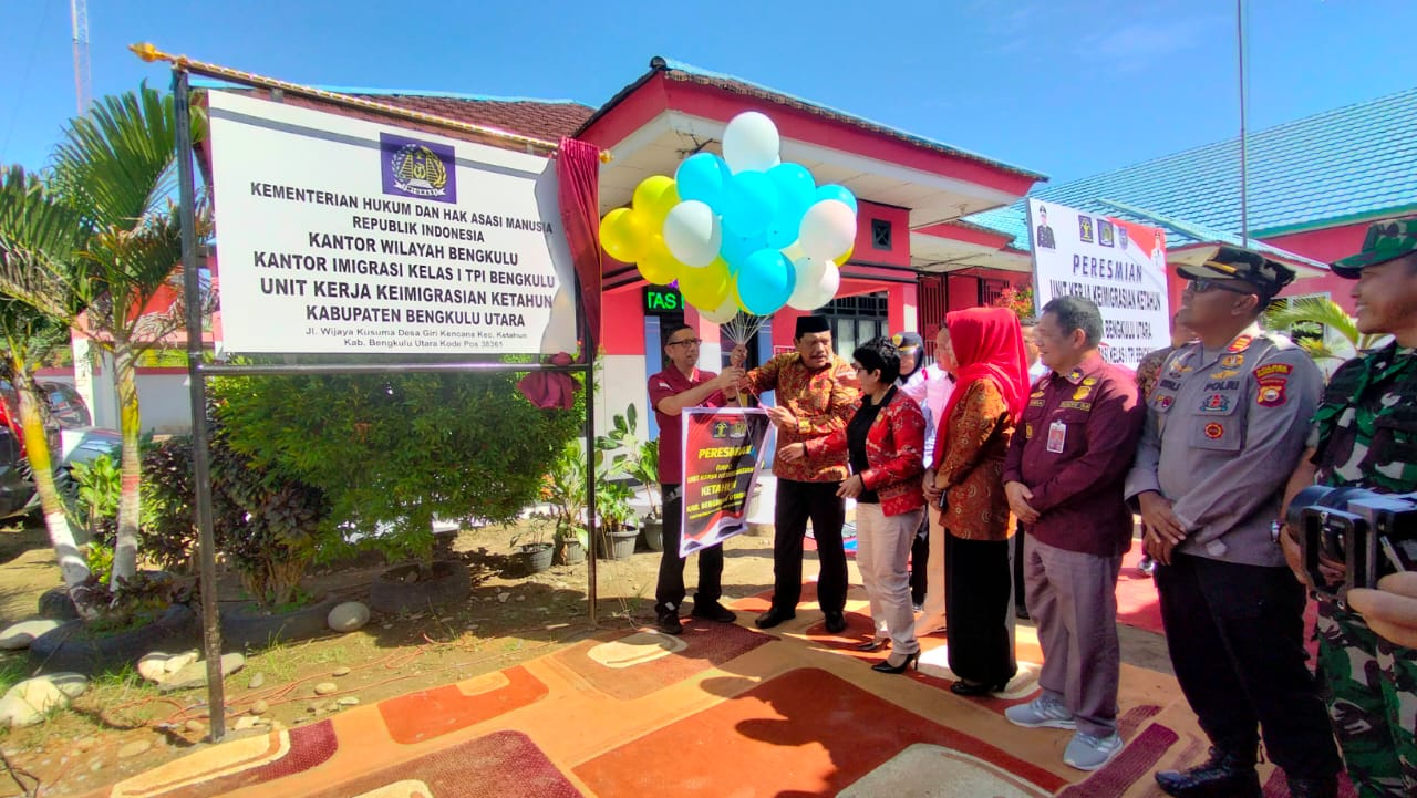 PRO BENGKULU – Bupati Bengkulu Utara Ir.Mian didampingi istri yang juga Ketua Tim Penggerak PKK, Ny. Eko Kurnia Ningsih meresmikan Unit Kerja Keimigrasian (UKK) di Balai Desa Giri Kencana kecamatan Ketahun, Jumat (07/07/2023).